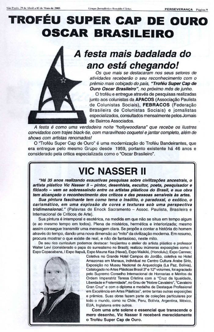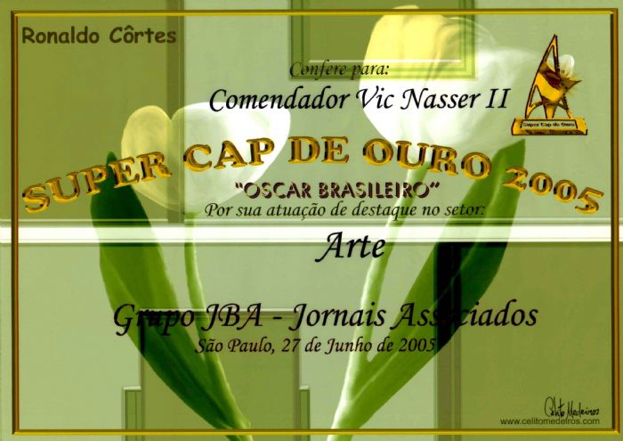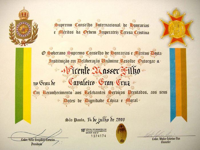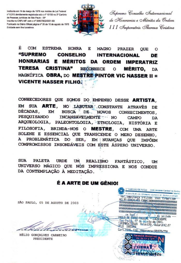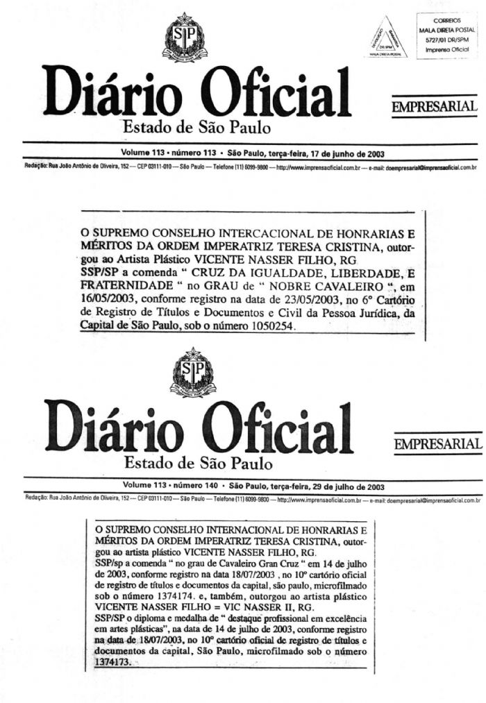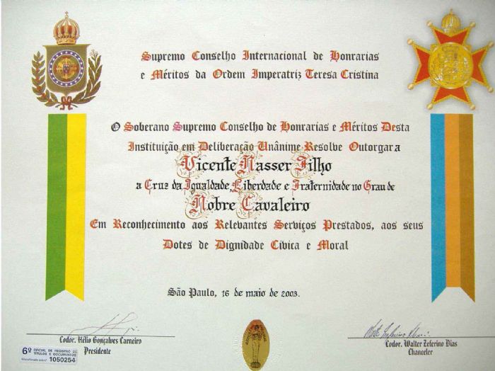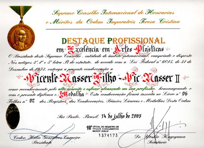 Awards received by vic Nasser II , when anointment as " Noble Knight " and " Knight Grand Cross " and medals for "Excellence in Visual Arts " , the " Supreme International Honors Council and Merit Order of the Empress Thereza Christina