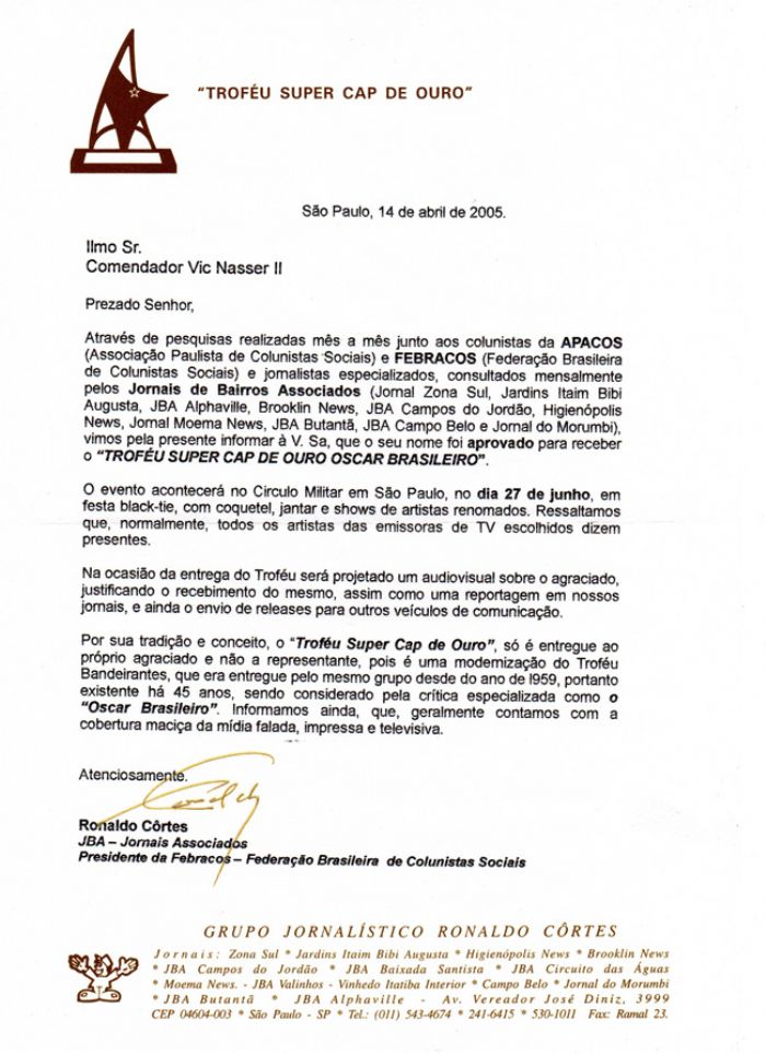Super Cap de Ouro - letter (Super Golden Cap letter)